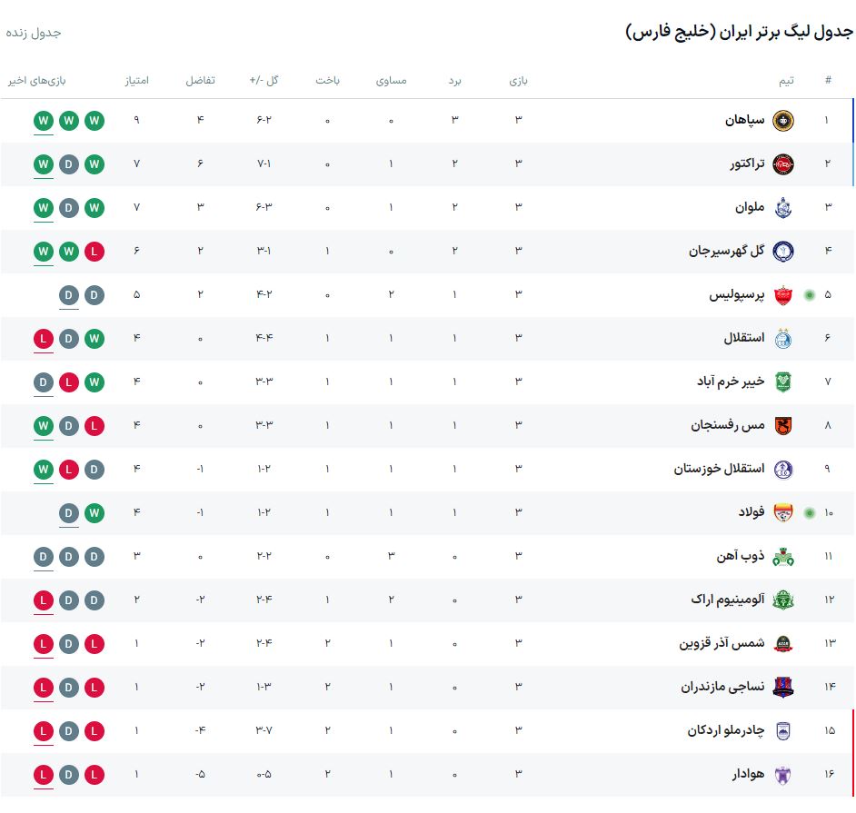 جدول لیگ برتر ایران در پایان هفته سوم رقابت ها:
