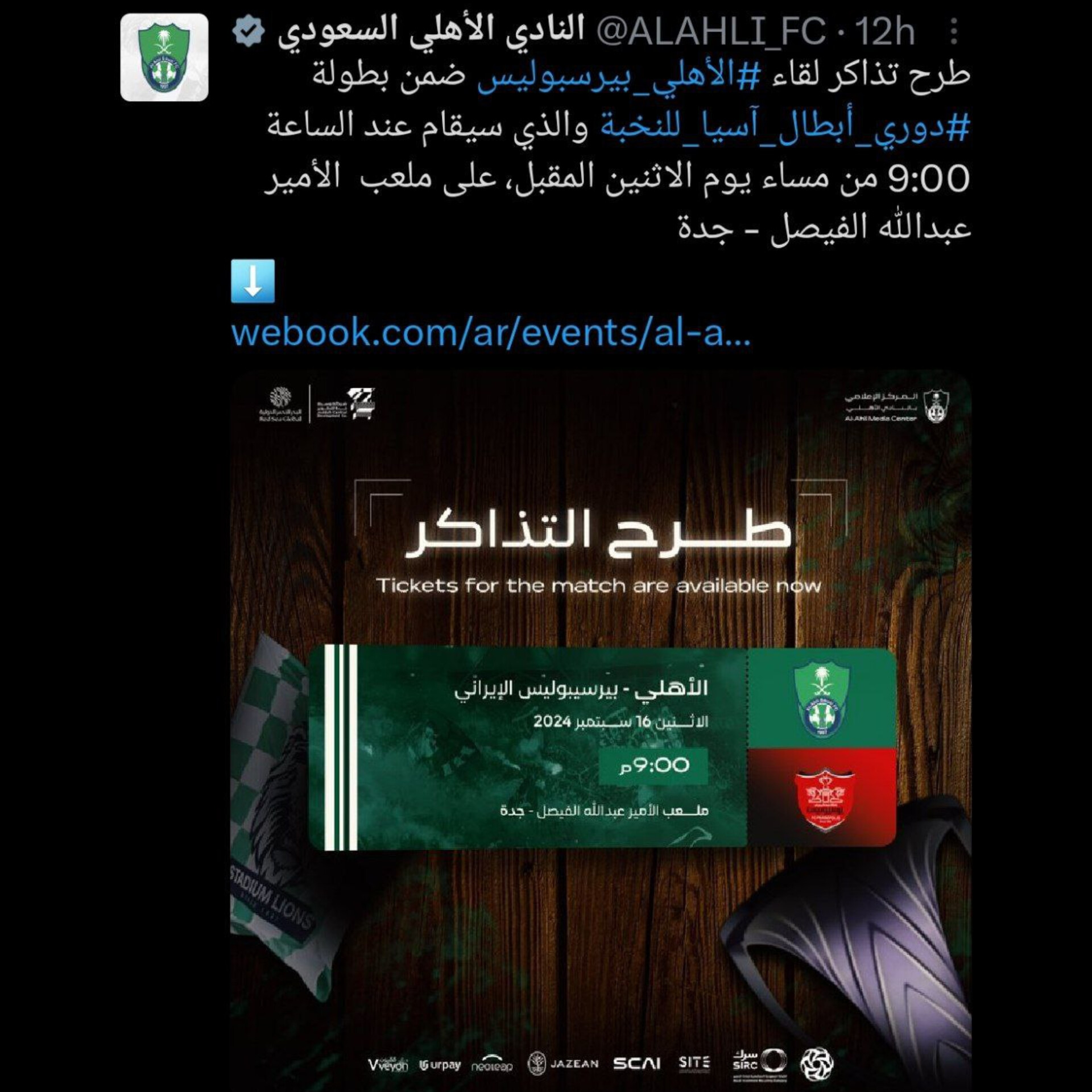 برای بلیت فروشی مسابقه #لیگ_نخبگان_آسیا؛اقدام جنجالی الاهلی؛ ستاره پرسپولیس حذف شد!باشگاه الاهلی عربستان درحالی بلیت فروشی بازی پرسپولیس را شروع کرد که لوگوی باشگاه پرسپولیس را بدون ستاره منتشر کرده است.